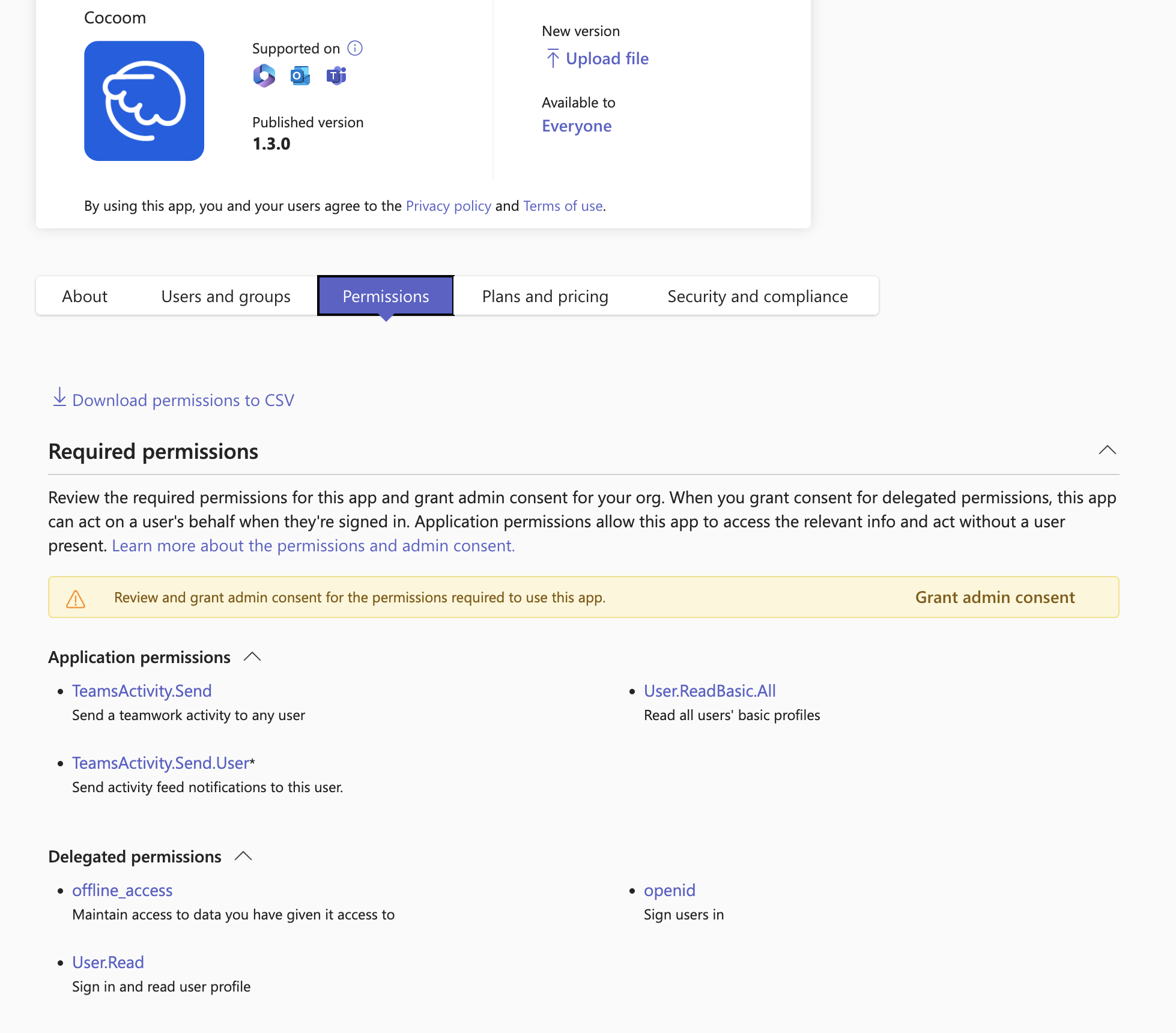 Cocoom Teams App requires a grand admin consent to be fully functional. This is a one-time action that must be done by a Teams administrator.